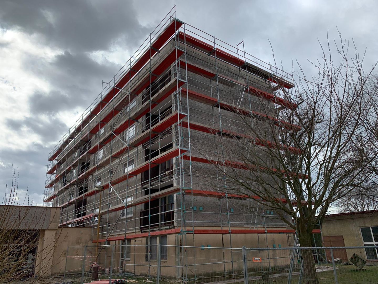 Revitalisation works by Timra company in order to reduce the annual energy consumption is one of many projects where was used our scaffold system – SCAFOM-RUX. All support structure were executed by our colleagues from the division of Scaffolding and support structures. Hot-dip galvanized quick-setting scaffolding copying the individual curves of the building was the ideal solution for thermal insulation of the building, new facade and replacement of window fillings.